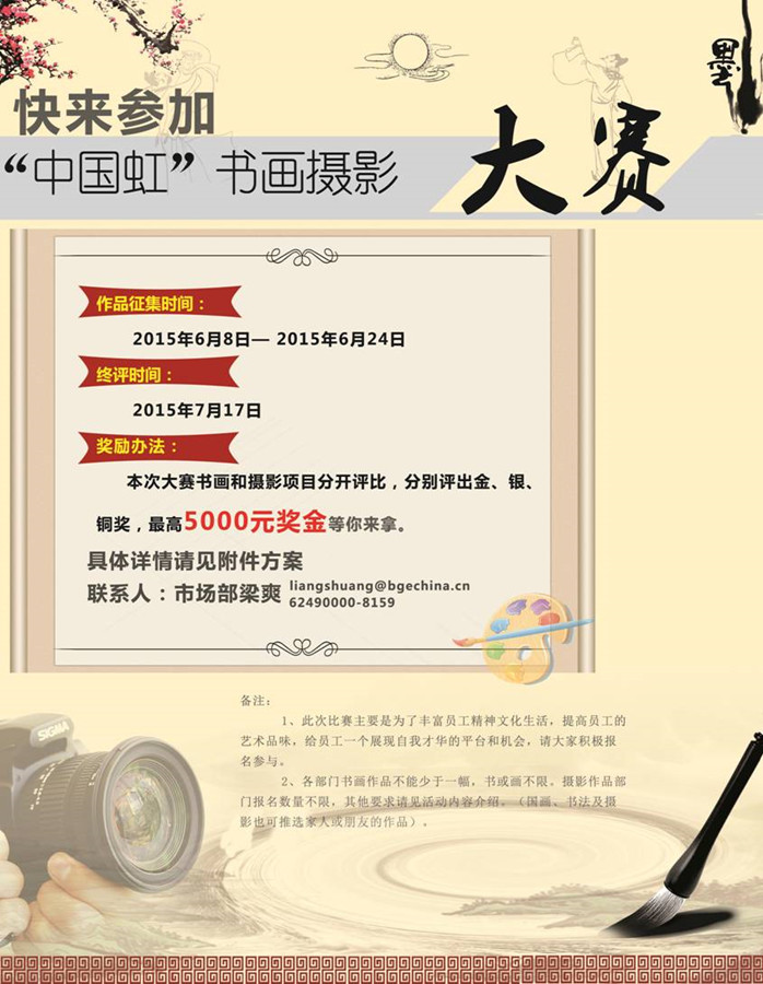為了豐富員工精神文化生活,提高員工的藝術品味,延續前五屆“中國虹”文化周活動的影響,進一步實現弘揚中華傳統文化這一永恒主題,同時與高能環境2015文化藝術節其他各項活動相得益彰,特組織本屆比賽,具體內容如下: