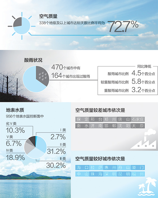 據環(huán)保部環(huán)境監(jiān)測司司長羅毅介紹,2015年上半年,國家環(huán)境監(jiān)測網繼續(xù)開展環(huán)境空氣、酸雨、地表水等各環(huán)境要素監(jiān)測。按照《環(huán)境空氣質量標準》,全國338個地級及以上城市達標天數比例平均為72.7%,其中輕度污染比例為18.7%,中度污染占5.2%,重度污染占2.7%,嚴重污染占0.7%。首要污染物為PM2.5。