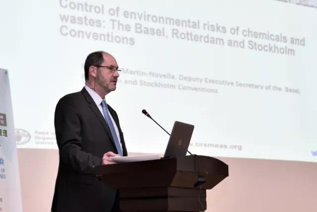 聯(lián)合國(guó)環(huán)境規(guī)劃署三公約秘書(shū)處副執(zhí)行秘書(shū)Carlos Martin-Novella、聯(lián)合國(guó)環(huán)境規(guī)劃署駐華代表處代表涂瑞和、生態(tài)環(huán)境部固體廢物與化學(xué)品管理技術(shù)中心副主任胡華龍分別致辭。