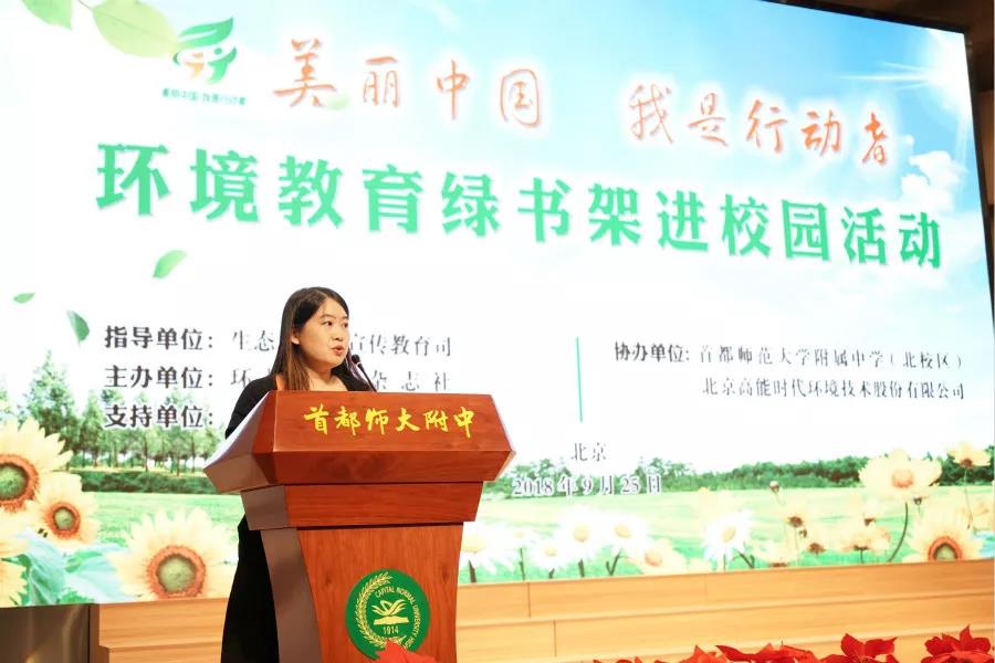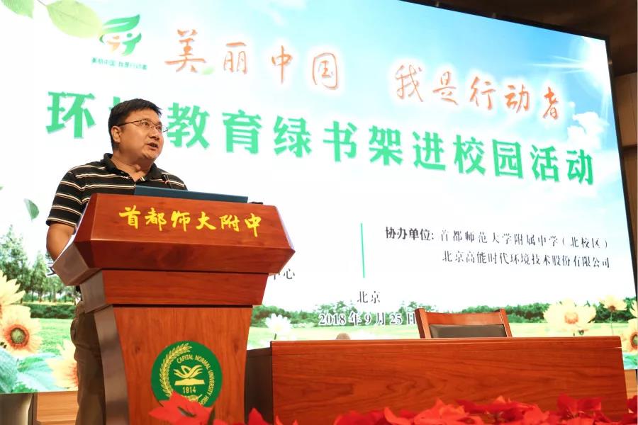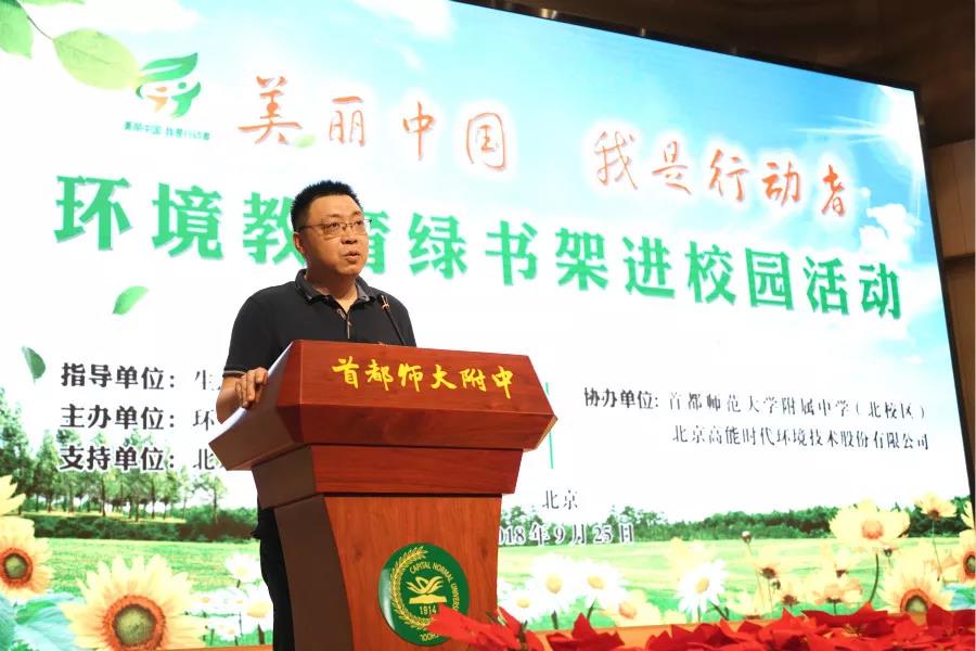 為促進環境保護和生態文明知識進校園,推動北京市中小學環境教育工作,9月25日,由《環境教育》雜志社主辦,生態環境部宣傳教育司指導,高能環境協辦的“綠書架”進校園公益活動在北京市首都師范大學附屬中學(北校區)舉行。北京市環保宣傳中心主任張立新、《環境教育》雜志社社長王曉飛等領導出席活動。