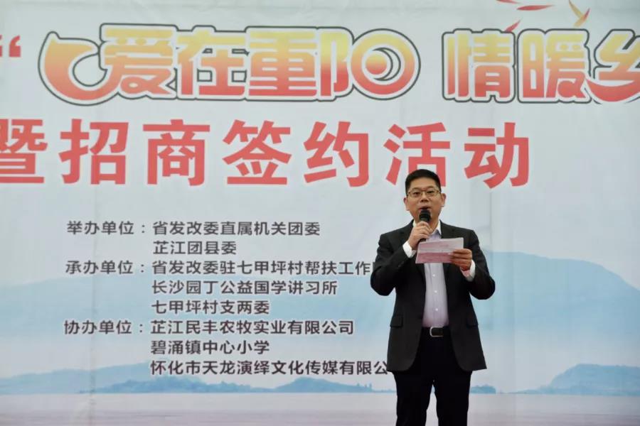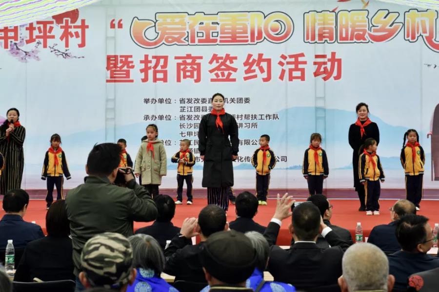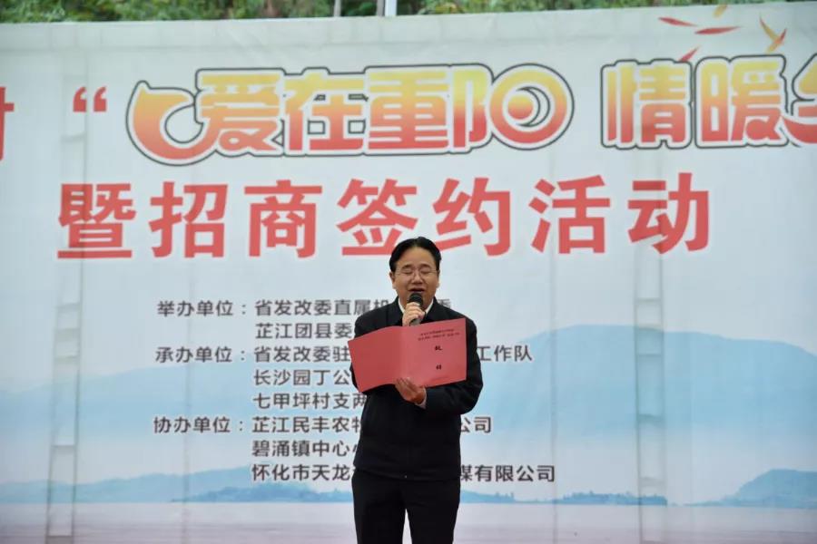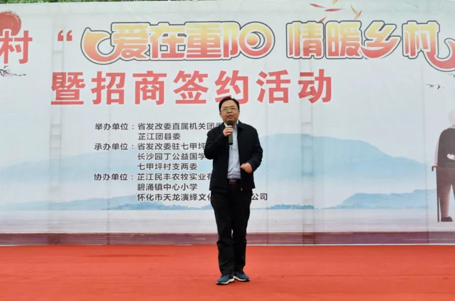 為弘揚中華民族尊老的優良傳統,豐富老年人精神文化生活,關愛七甲坪村老年人,10月14日,由湖南省發改委直屬機關團委、芷江縣團委聯合主辦,省發改委駐七甲坪幫扶工作隊、長沙園丁公益國學講習所、七甲坪村支兩委承辦的“愛在重陽,情暖鄉村”、“隆平文化驛站·高能環境七甲坪村站”授牌儀式在芷江縣碧涌鎮七甲坪村舉行。