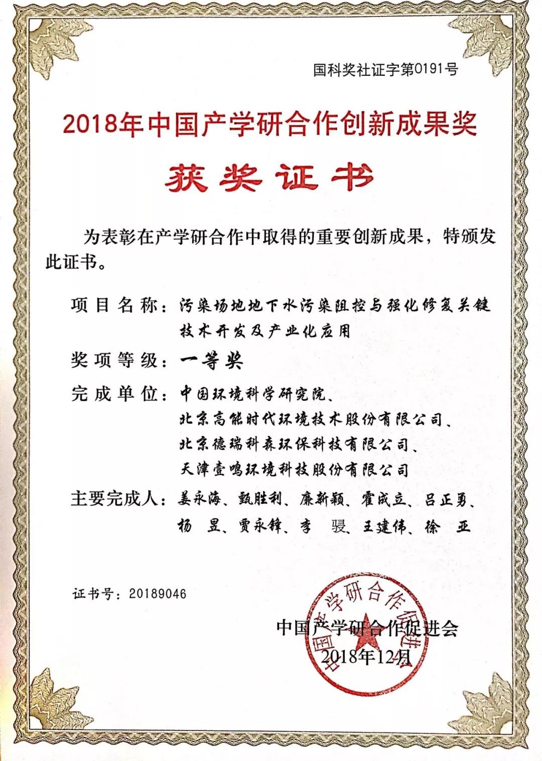 會議表彰了2018年在產學研合作、成果轉化、軍民融合、工匠精神等方面作出貢獻的先進單位和個人,高能環境憑借“地下水污染阻控與多級強化修復關鍵技術及應用”(以下簡稱為“技術應用”)榮獲2018年中國產學研合作創新成果一等獎。據悉,該獎項是目前我國面向產學研協同創新的最高榮譽,由科技部和國家科技獎勵辦公室批準,國家發改委等24個“國”字頭單位支持,中國產學研合作促進會設立和頒發。