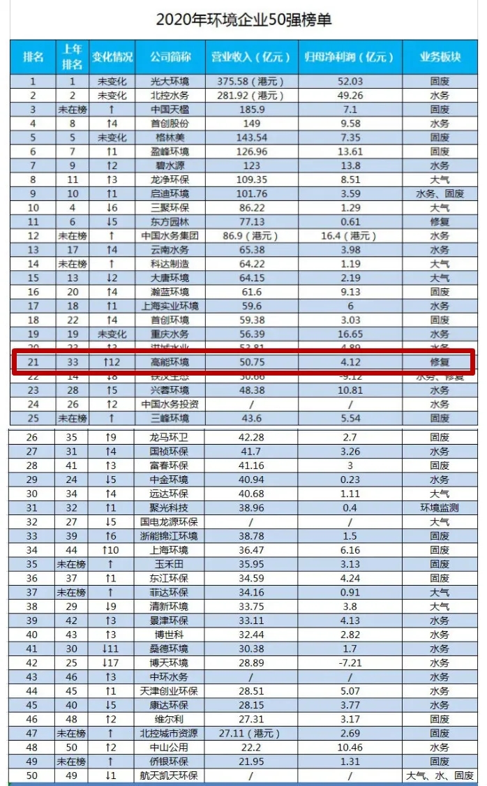 會上,全國工商聯環境商會發布“2020中國環境企業50強”榜單,高能環境榮登榜單且名列第21名,較去年相比排名上升12名,是榜單名次上升最多的企業。
