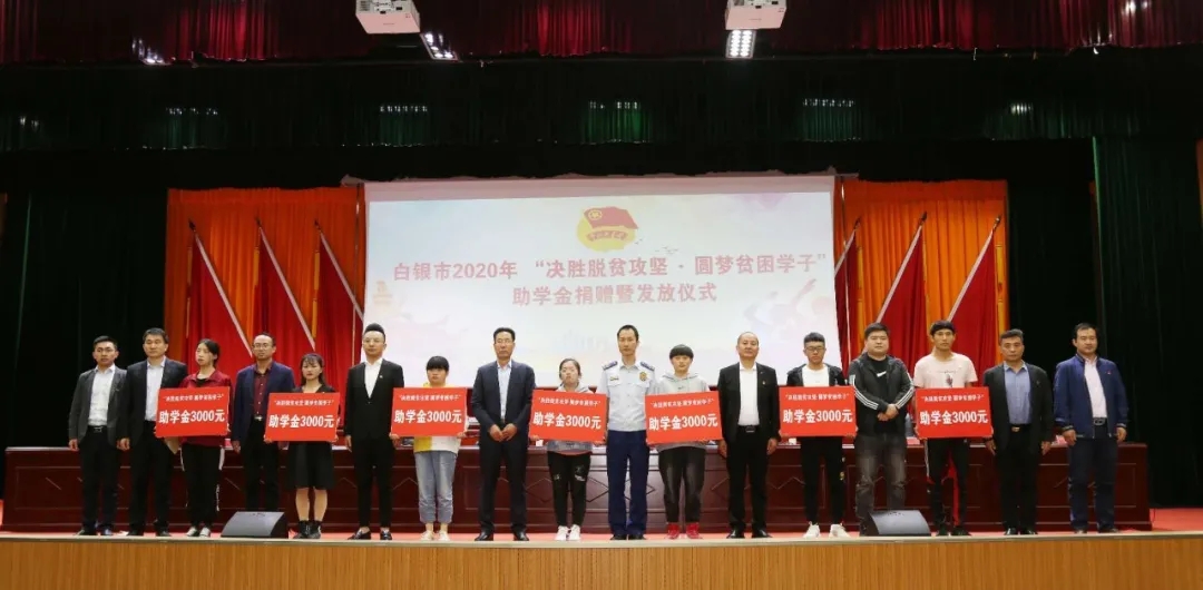 近日,白銀市2020年“決勝脫貧攻堅·圓夢貧困學子”助學金捐贈暨發放儀式在景泰縣圓滿落成。白銀市政協副主席常升文、市總工會副主席洪海濤、市婦聯副主席楊鵬宇、靖遠縣委副書記高斌、會寧縣委常委、組織部部長周春材、白銀區副區長陶韋娜、平川區副區長肖誠;縣區團委負責人、捐資愛心企業單位及個人,受助學生代表及家長共計300余人參加了捐贈儀式。