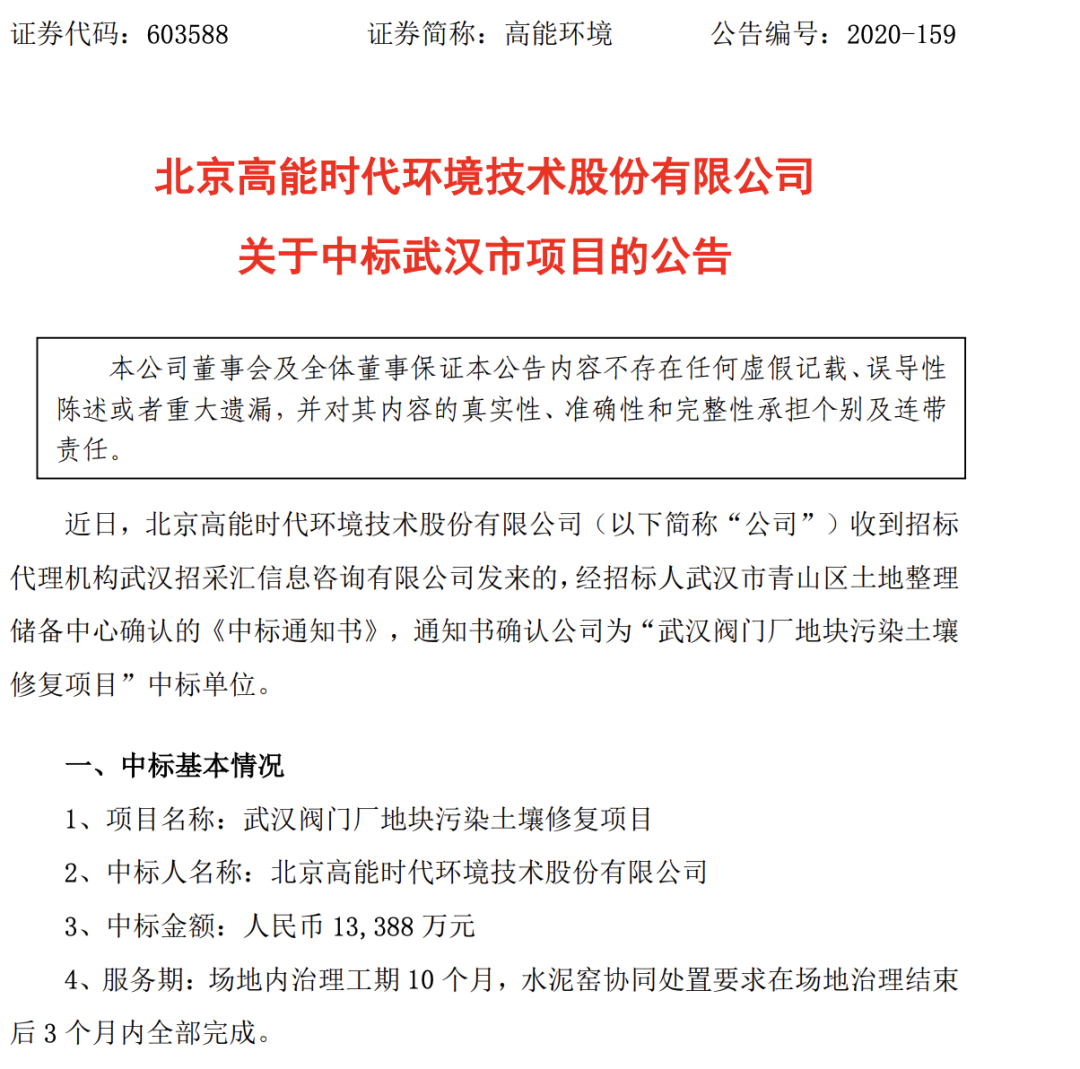 2020年注定是無數艱難和挑戰的極不平凡的一年,在疫情影響下,高能環境于不確定性環境中不斷調整、不斷突圍,保持業績高速增長,頻傳中標喜訊。武漢閥門廠地塊污染土壤修復項目的中標展現了行業內對公司過硬實力的高度認可,為高能環境2020年的收官工作添上了濃墨重彩的一筆,預計將對公司未來的經營業績產生積極影響。